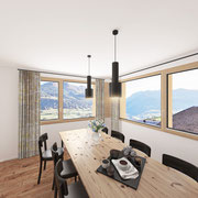 Die Wohnung bietet ein offener Wohnen-Essen-Kochbereich mit Zugang zum Laubengang auf der Westseite.