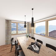 Der Balkon auf der Westseite ist ganz gedeckt und bietet somit Regen- und Sonnenschutz. Vom Balkon oder auch Laubengang genannt ist der grosse Sitzplatz von